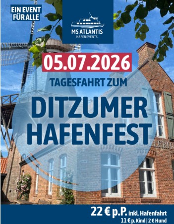 MS ATLANTIS bringt euch mitten ins Geschehen zum Ditzumer Hafenfest. Genießt die entspannte Fahrt, maritime Atmosphäre und den Blick auf die Küste.